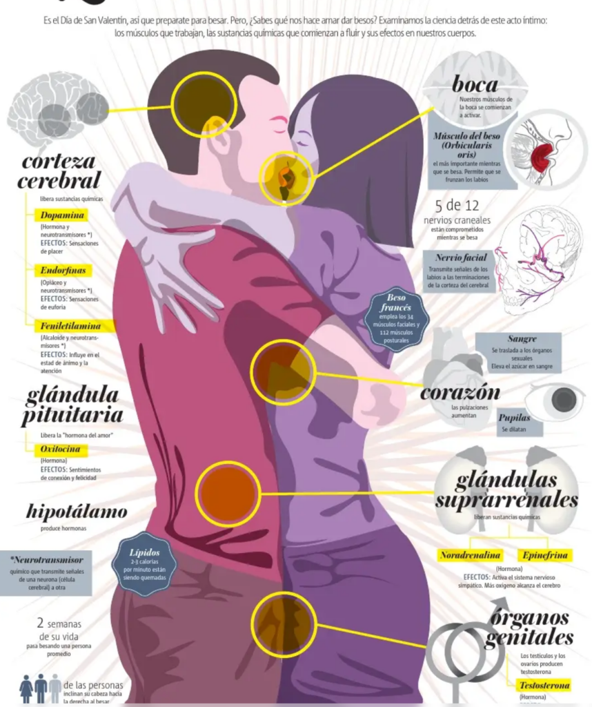 ¿Quién no recuerda la experiencia que fue su primer beso romántico? El recuerdo es importante, no lo olvidamos por tiempo que pase, y no importa si fue valioso o insignificante para el resto de nuestras vidas. El caso es que sentimos que cogíamos el mundo con las manos, porque el enamoramiento es la emoción más intensa que podemos experimentar los mamíferos. Los humanos matamos y nos hacemos quemar en la hoguera por amor, y sin importar lo viejos que estemos. Cuando alguien nos gusta, lo primero que deseamos es besarlo. Ese primer beso que nos dimos con cada nueva persona en el trascurso de nuestra vida fue intenso; se sintió en los labios, la lengua, los dientes, muy adentro, y la sensación bajó hasta los dedos de los pies. Su memoria se nos quedó en todo el cuerpo, como aleteos de mariposas. Y como esas postimágenes que vemos al cerrar los ojos, horas adelante, días adelante, después de haber mirado una luz intensa con color, así son los besos, días después cerramos los ojos y volvemos a sentir todo eso que sentimos durante esos minutos.