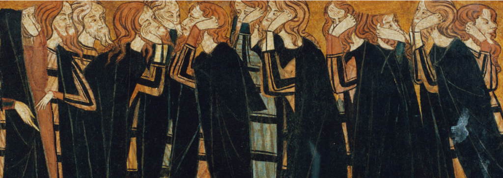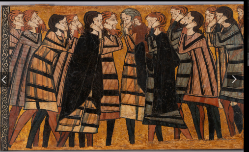 Cito lo que dice la ficha que cuelga en el museo de Barcelona: “En la obra Plañideros, un grupo de hombres vestidos de luto lloran amargamente la muerte del matrimonio Sánchez Carrillo. Los personajes, con la cabeza descubierta y largas cabelleras de color rubio y castaño, demuestran públicamente su dolor de forma ostentosa estirándose el pelo y arañándose la cara. De hecho, todas las figuras han sido representadas con heridas en el rostro fruto de estas muestras de luto extremo. El grupo de hombres va vestido con una ropa de luto muy habitual en toda la Europa medieval que consistía en una túnica larga y ancha con un vistoso estampado de rayas donde el negro se combinaba con otras tonalidades. Aquí la mayoría los lleva con colores ocres o azulados. Por último, casi todos tienen los hombros y las espaldas cubiertas con mantos negros, el color tradicional del duelo.”