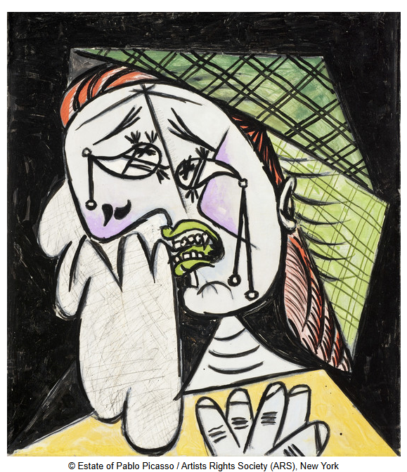 Demos un salto en el tiempo para llegar a Pablo Picasso y sus mujeres que lloran con pañuelo o sin pañuelo. Picasso describe el drama interior. No cabe duda del sufrimiento intenso en esos rostros. No tendría sentido decir que son caras deformes, pues el llanto deforma el gesto. Quizás por eso nos apena mirar de frente a quien llora, pues es un rostro nuevo, irreconocible y, a veces, espantoso. Picasso ve lo que solemos evitar y lo retrata de forma contundente.