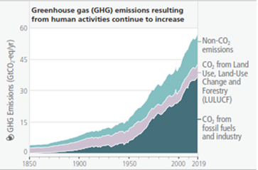 Figura 1. Representación del incremento de los gases efecto invernado por actividad antrópica. Fuente: The Intergovernmental Panel on Climate Change [IPCC], (2023, p. 43). Climate Change 2023. Synthesis Report. www.ipcc.ch IPCC. El IPCC permite la reproducción de contenidos de esta publicación sin autorización, siempre que se indique claramente la fuente completa.