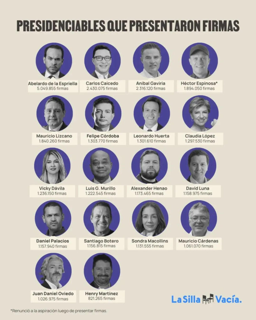 22. Entre 18 candidatos recogieron 28,5 millones de firmas para aspirar a la presidencia de Colombia. ¿Cuántas de esas firmas son auténticas? ¿Firmaron esta vez los muertos? Alguien que me explique, técnicamente hablando, ¿Cómo se revisan 28 millones y pico de firmas antes del 21 de enero? Si aparecen firmas chimbas, ¿habrá castigo para esos candidatos por falsificación o usurpación?