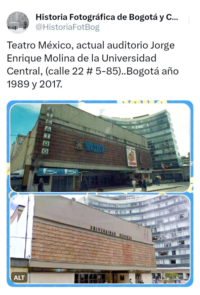 (El Teatro México, construido a finales de los años 50, es hoy un auditorio y pertenece a la Universidad Central).