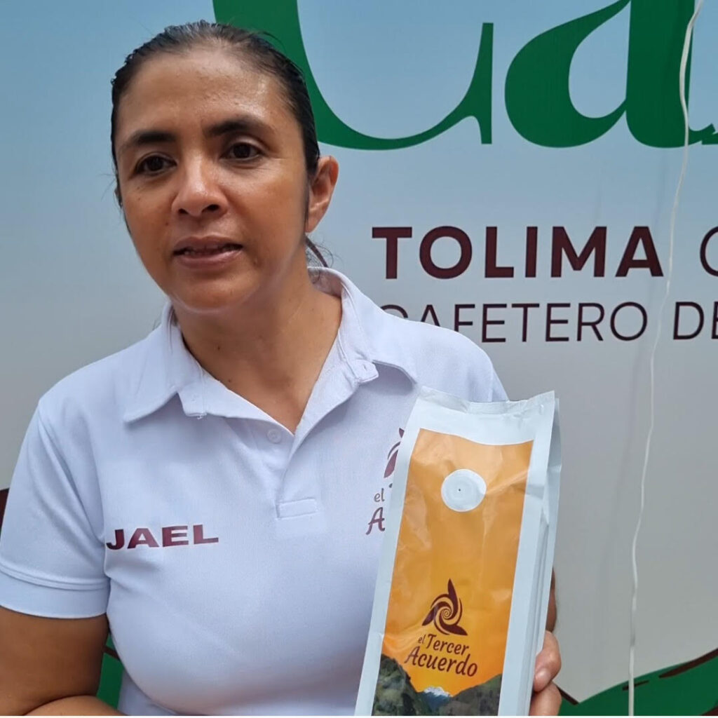 Jael Baquiro nació en medio de la guerra, en Gaitania, un territorio cafetero. Desde 2024, está al frente de La tienda del café El Tercer Acuerdo, en Ibagué, gracias a un programa de asociatividad que impulsa la Presidencia de la República.