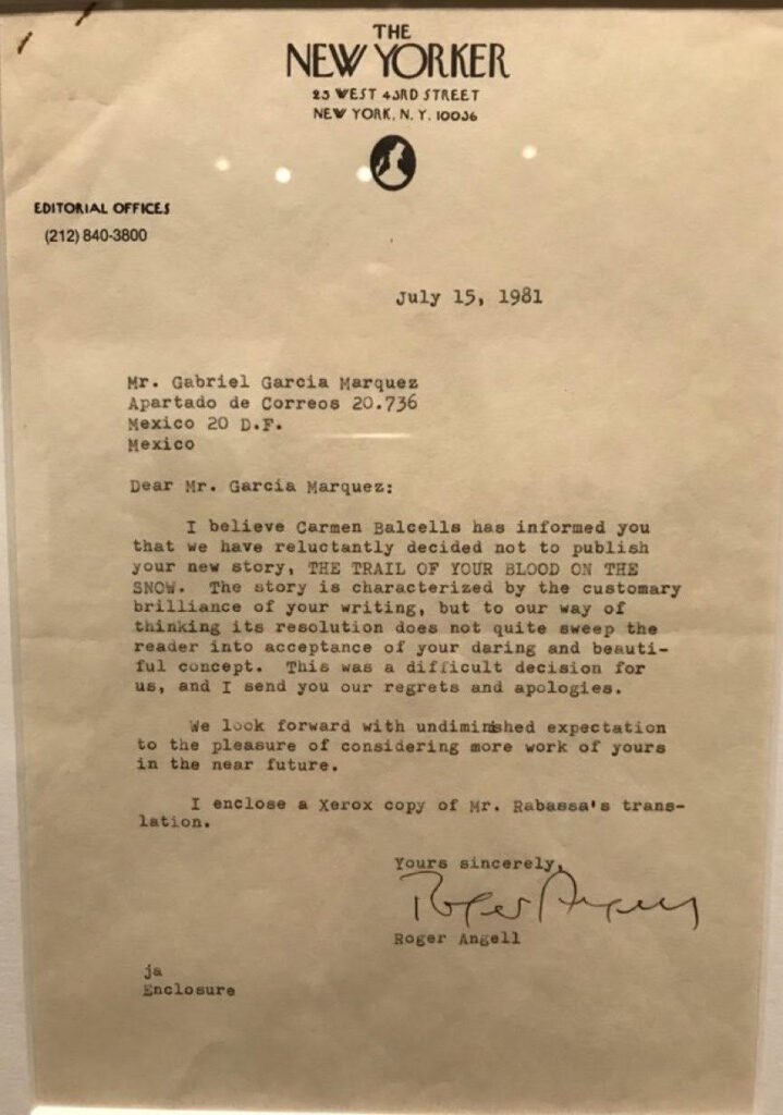 A propósito del maestro Gabo, vale la pena recordar que en 1981, un año antes de ganar el Premio Nobel de Literatura, recibió un no como respuesta cuando envió a la revista su cuento “El rastro de tu sangre en la nieve”. El sitio web de Literland publicó la carta. No lo cuenta el documental pero así fue.