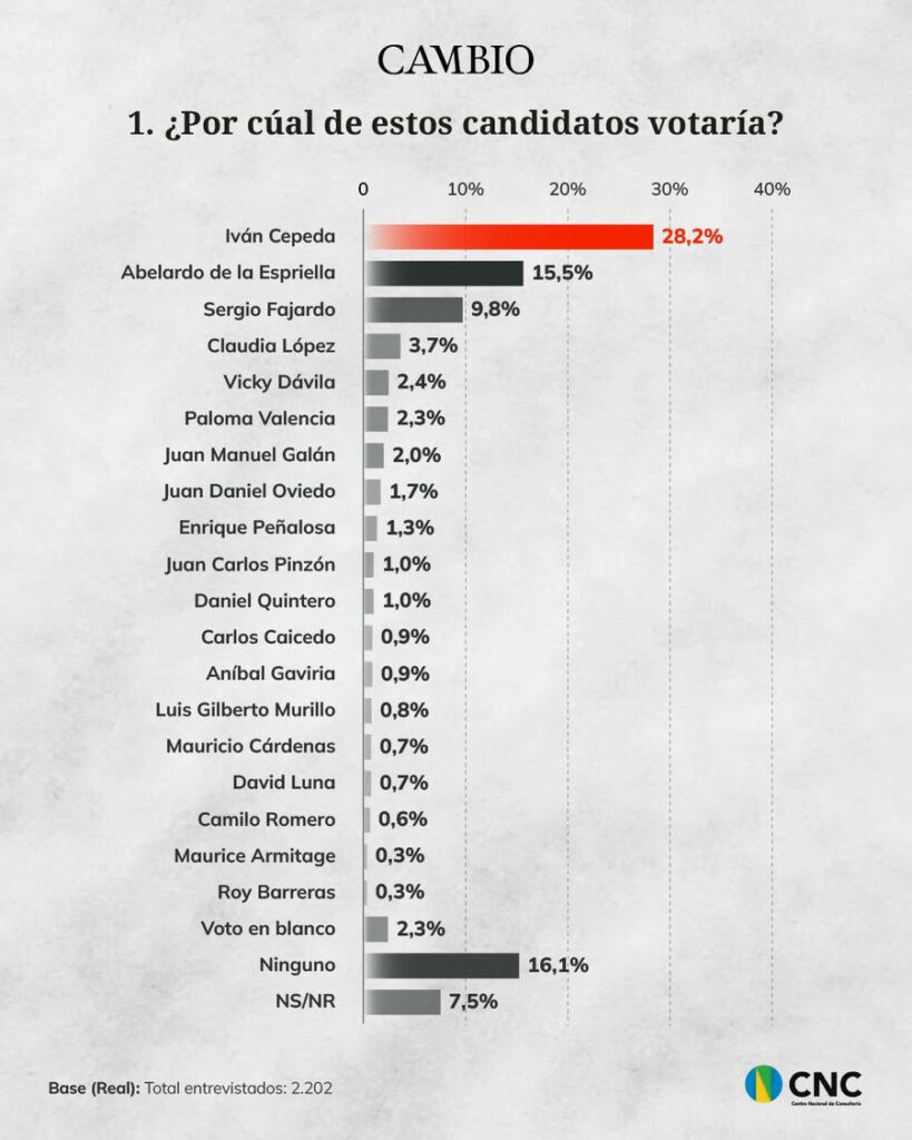 En la más reciente de las encuestas (la del CNC, pagada por la revista Cambio), gana Iván Cepeda con el 28,2%, pero a diferencia de la de El Tiempo, donde crece el uribismo, en esta crece el llamado centro, representado por Sergio Fajardo (9,8%) y Claudia López (3,7%), en tanto que el uribismo decrece con Paloma Valencia (2,3%).