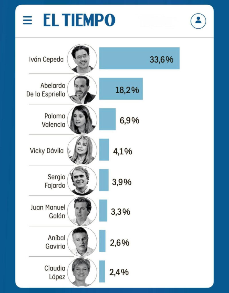 Y noten un detalle, el diario del banquero Luis Carlos Sarmiento tituló así la primera plana de su edición dominical: “Cepeda, De La Espriella y Paloma lideran intención de voto para primera vuelta”. A eso llamo yo un titular tendencioso. Paloma Valencia no pasa de un dígito, así que resulta muy dudoso que esté liderando nada por ahora, menos cuando está a más de 26 puntos de distancia de Cepeda, quien lleva la delantera