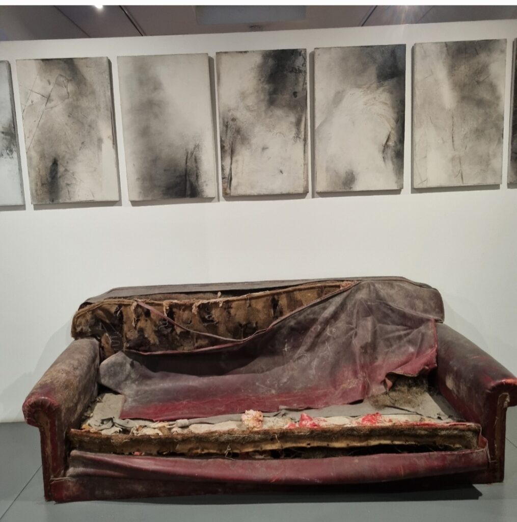 El sofá, rescatado de los escombros del Palacio de Justicia, en 1985, se encuentra exhibido en el Museo Nacional de Colombia. Fotografías: Alexander Velásquez.