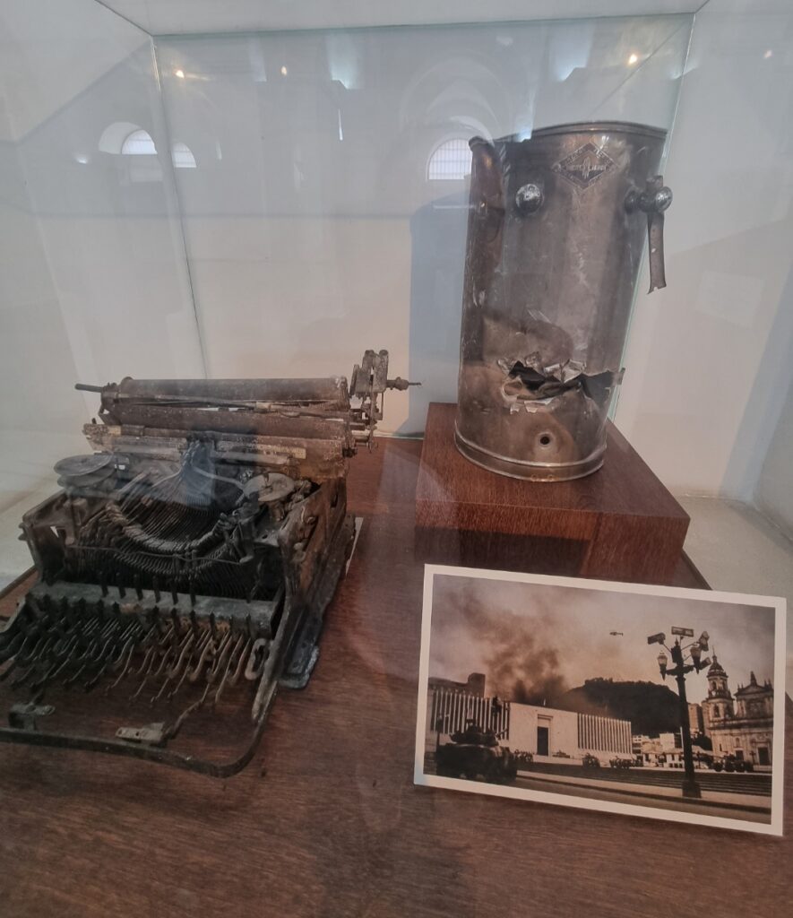 Máquina de escribir Remington incinerada en la toma del Palacio de Justicia que perteneció a José Antonio Salazar Cruz y la greca de la cafetería, junto a una fotografía del Palacio en llamas, del archivo del Semanario Voz.