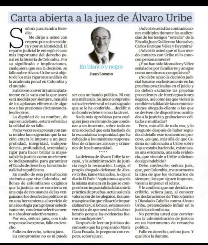 Su historia es la del galanista que cayó en brazos del uribismo para luego atrincherarse en el periodismo. El Juan Lozano político publica una columna semanal en El Tiempo, el diario que ya no pertenece a la familia Santos, sino a don Luis Carlos Sarmiento Angulo, dueño de empresas, bancos y medios de comunicación. Su última columna produce vergüenza más no extrañeza. Se titula “Carta abierta a la juez de Álvaro Uribe”. No entiendo por qué insisten en llamarla juez si es jueza.
