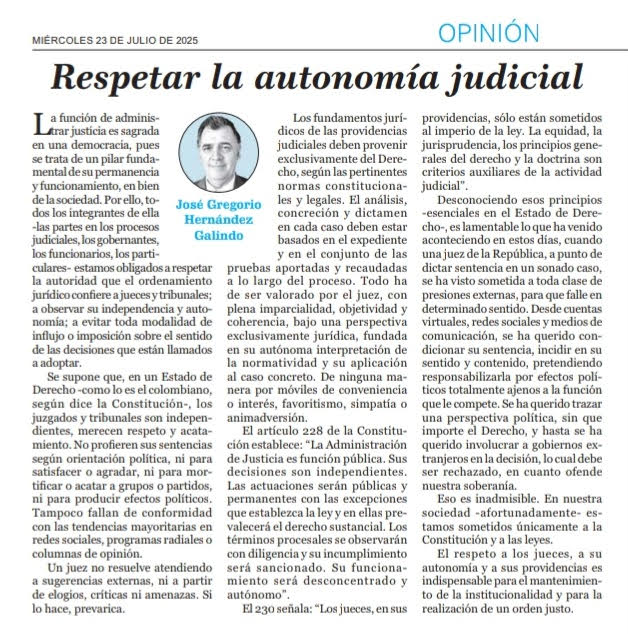 La columna más sensata la escribió el exmagistrado José Gregorio Hernández en el diario El Nuevo Siglo, bajo el título: “Respetar la autonomía judicial”. Dice el jurista y catedrático universitario: “… en un Estado de Derecho -como lo es el colombiano, según dice la Constitución-, los juzgados y tribunales son independientes, merecen respeto y acatamiento. No profieren sus sentencias según orientación política, ni para satisfacer o agradar, ni para mortificar o acatar a grupos o partidos, ni para producir efectos políticos. Tampoco fallan de conformidad con las tendencias mayoritarias en redes sociales, programas radiales o columnas de opinión”.