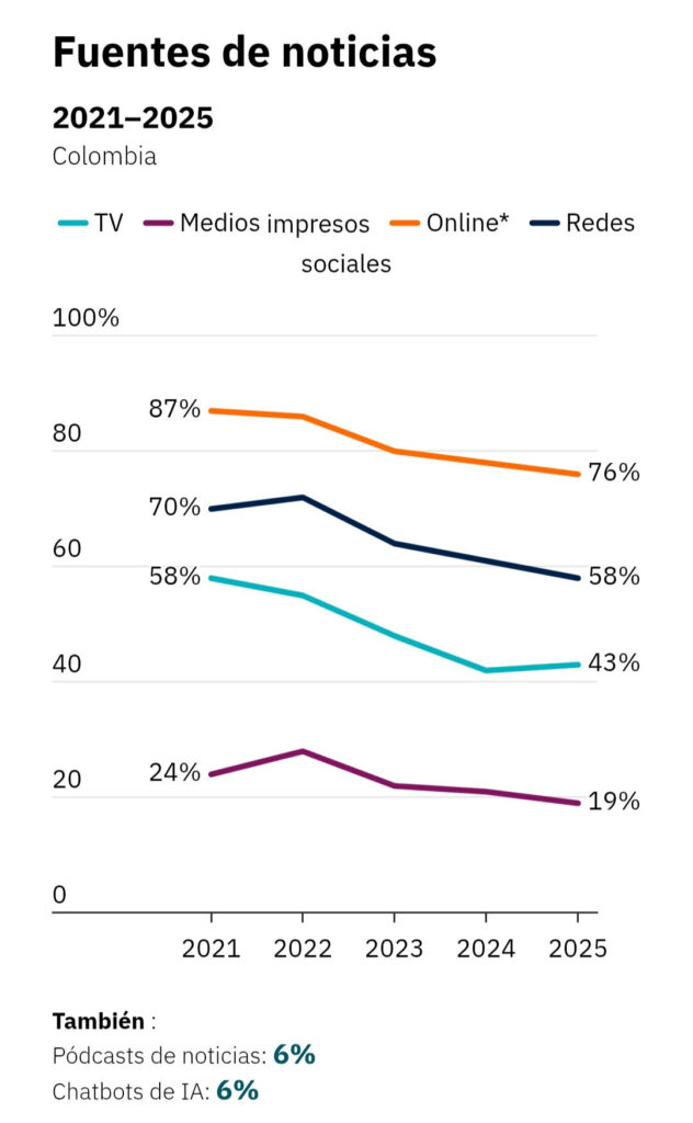 Hay un informe, el último Digital News Report, del Instituto Reuters, según el cual en Colombia la confianza en las noticias cayó dos puntos este 2025 (apenas 32%), respecto al año anterior (2024) cuando se situó en el 34%.