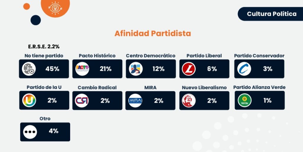 Según la misma encuesta (que puede descargarse aquí) el 21% de los colombianos dijo tener afinidad política con el Pacto Histórico, que es líder por encima del Centro Democrático (12%); Partido Liberal (6%) y Partido Conservador (3%). ¿Por qué nadie ha dicho que el bipartidismo ni siquiera llega al 10%? ¿Están en crisis los dos partidos tradicionales? Por lo menos debemos decir que estos resultados deberían tener preocupados a los señores César Gaviria y Efraín Cepeda, dueños de los trapos rojo y azul, respectivamente.