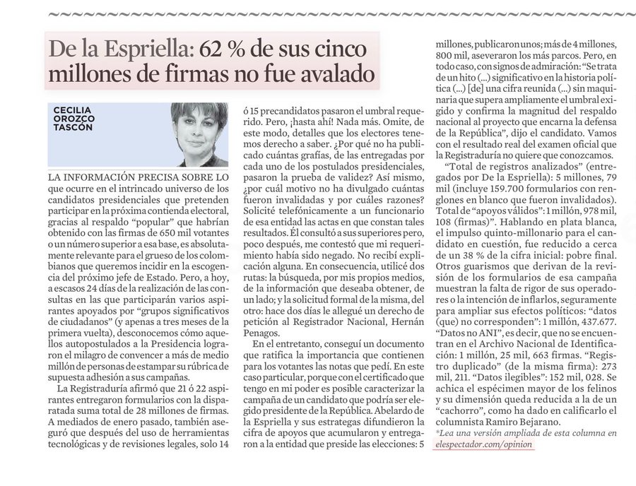 Nos acostumbramos al mal comportamiento de ciertos políticos sin que haya consecuencias. ¿Quién responde, por ejemplo, por las firmas supuestamente chimbas que presentaron candidatos como Abelardo De La Espriella, Vicky Dávila o Claudia López para avalar sus candidaturas presidenciales? ¿Es esto trampa o delito?
