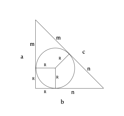 Los dos segmentos de rectas tangentes, trazados desde un mismo punto exterior a un círculo, tienen la misma longitud; por lo tanto los segmentos que unen los vértices de los ángulos no rectos del triángulo y los puntos de tangencia con la circunferencia son, en cada caso, de la misma longitud; es decir men un caso y n en el otro.