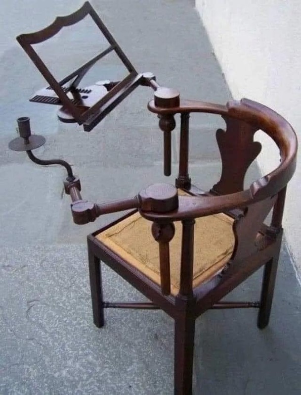 También hay ejemplos de muebles muy particulares, diseñados para cumplir exclusivamente una función, como es el caso de esta ingeniosa silla francesa del siglo XVIII, especialmente diseñada para leer un libro con las manos libres y con soporte para una vela, como fuente de luz, por si si fuese necesario continuar la lectura al anochecer.