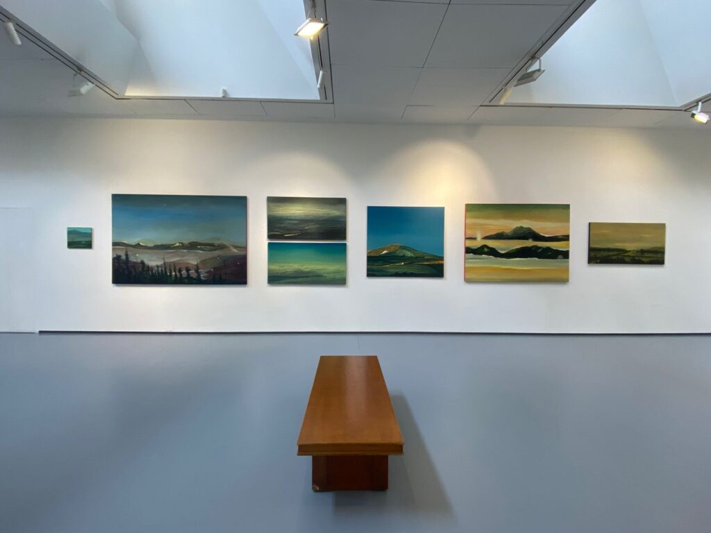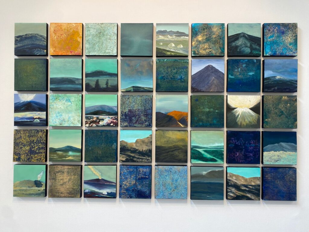 Caminar la muestra es atravesar volcanas silenciosas, montañas que respiran, cielos que parecen estar a punto de pronunciar una verdad que todavía no comprendemos del todo. Hay fuego contenido bajo capas de color. Hay una vida en la tierra después de nosotros, pero no como espectáculo apocalíptico, sino como continuidad inevitable. Como si la naturaleza, sin dramatismo, siguiera su curso.