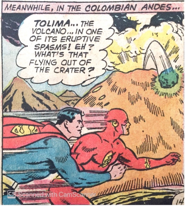 Years later, as a grown man, Superman decided to wager a race around the world with his friend Flash to determine who was the fastest. While traveling through Colombia, they witnessed the eruption of the Tolima volcano, which, according to the comic, erupted in 1967. Interestingly, kryptonite was among the material it released, naturally affecting the Man of Steel. The truth is that the bet was for charitable purposes for the United Nations.