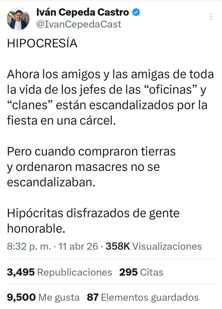 Senador y candidato Iván Cepeda: le escribo desde mi lugar como ciudadana y educomunicadora que se niega a aceptar la decadencia del diálogo público y la ilusión de la autocrítica que hoy parece inexistente en su sector. Usted invita al centro a votar por su propuesta; sin embargo, resulta difícil confiar en una alternativa política que se niega a reconocer sus propias fallas. Recientemente, usted utilizó sus redes para tildar de “hipócritas” a quienes se escandalizan por las fiestas en las cárceles, recordándonos las tierras compradas y las masacres ordenadas por otros en el pasado. Ese mensaje es la confirmación de una metodología que el país ya no tolera: la evasión sistemática mediante el señalamiento de las atrocidades ajenas para justificar las indignidades del presente.