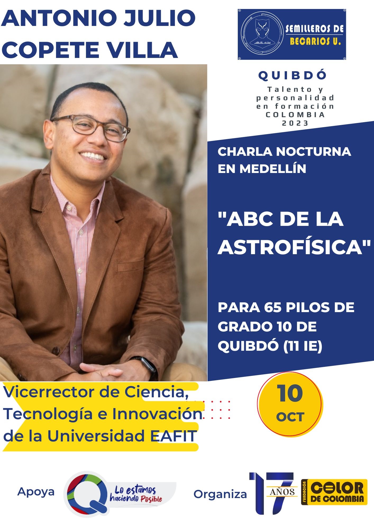 En la noche, recibirá en el hotel la visita del vicerrector de Ciencia, Tecnología e Innovación de la Universidad EAFIT, Antonio Copete, para una tertulia sobre “ABC de la astrofísica”.