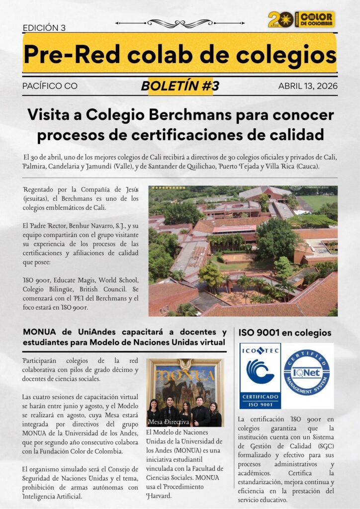 El 30 de abril, para compartir su experiencia de procesos de calidad con instituciones educativas privadas y oficiales invitadas por la Fundación Color de Colombia a una red colaborativa. También habrá conversatorio de delegados de licenciaturas de UniValle, Icesi, U. de San Buenaventura Cali y Universidad Santiago de Cali sobre prácticas pedagógicas y profesionales.