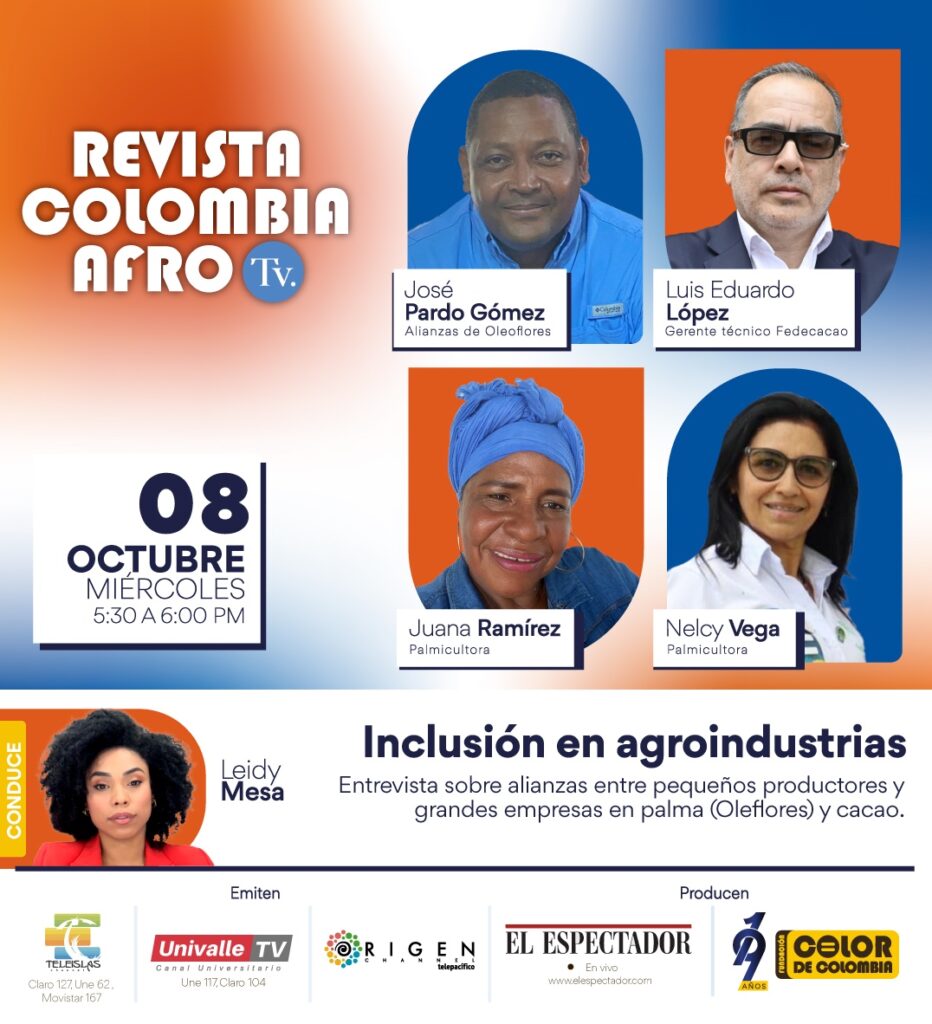Este miércoles 08 de octubre, de 5:30 pm a 6:00 pm, en el portal web y redes sociales (YouTube y FaceBook) de El Espectador, entrevista con José Pardo, gerente de Alianzas Estratégicas del Grupo Empresarial Oleoflores; Luis Eduardo López, gerente técnico de Federación Nacional de Cacaoteros, Fedecacao, y las pequeñas palmicultoras Nelcy Vega (Becerril, Cesar) y Juana Ramírez (María La Baja, Bolívar), conducida por Leidy Mesa Medina, sobre inclusión de pequeños productores agrícolas en cadenas de valor agroindustriales.