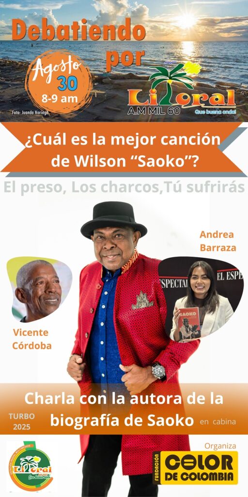 El 30 de agosto, encuentro en Apartadó (bar Suaveson, 5pm) en torno a la biografía del legendario cantante fallecido este año, y en Turbo, debate por la emisora Litoral AM 1160 (8-9 am) sobre cuál es la mejor canción de Saoko, con Andrea Barraza, autora del libro, en ambos momentos, quien viaja desde Medellín. Por…