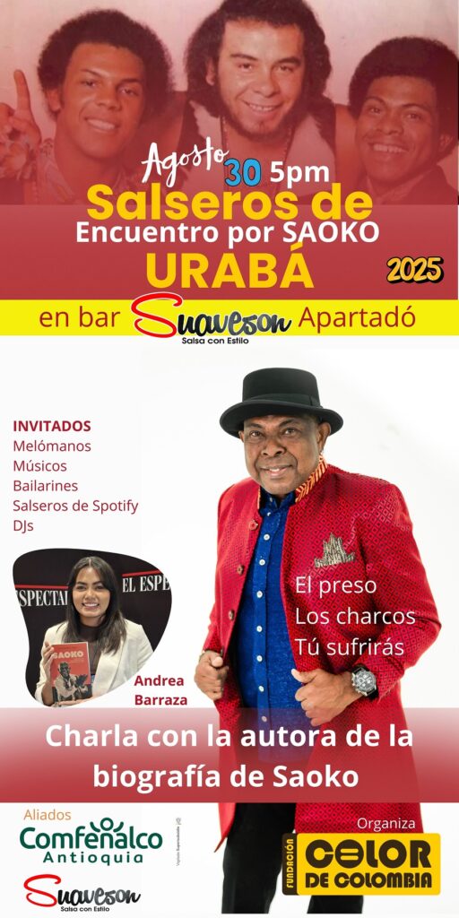 Por la tarde, desde las 5:00 p.m., el tradicional bar salsero de Apartadó y Urabá, Suaveson, será el escenario de “Salseros de Urabá, encuentro por Saoko”, un espacio pensado para melómanos, músicos, bailarines (de su casa y de la Academia Jairo Durango y otras), DJ’s y amantes de la salsa que deseen rendir homenaje al legendario cantante.