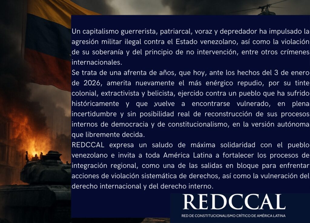 “El 23 de enero de 2026 se realizó la primera reunión de la Red de Constitucionalismo Crítico de América Latina (RedCCAL), con el objetivo de analizar el momento histórico, político y constitucional que atraviesa el Estado venezolano. La reflexión colectiva se propuso superar lecturas coyunturales o exclusivamente mediáticas, situando los hechos recientes —en particular los ocurridos el 3 de enero de 2026, que constituyeron una grave y cruel vulneración no solo del Estado venezolano, sino también de América Latina y del orden jurídico interamericano e internacional— dentro de un proceso histórico de larga duración, marcado por disputas estructurales en torno al poder, la soberanía, los recursos naturales y los proyectos constitucionales emancipatorios en la región.