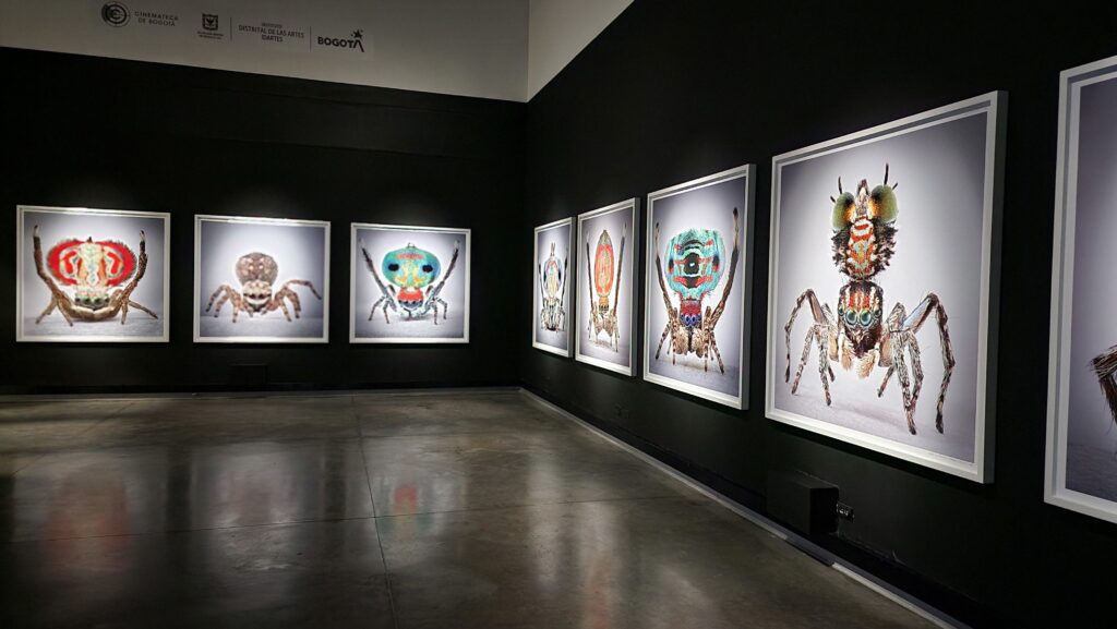 Arañas en el Paraíso María Fernanda Cardoso exhibe en la Cinemateca de Bogotá una obra sobre las conductas sofisticadas de cortejo de las arañas Maratus, conocidas como arañas pavo real, típicas de Australia.