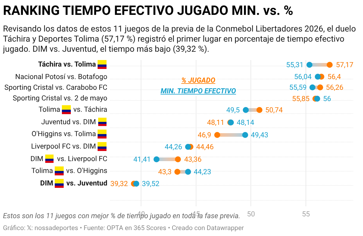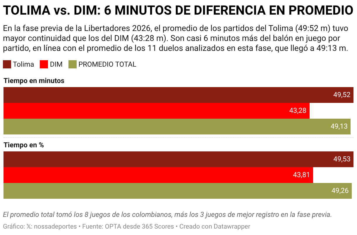 Este análisis tomó como muestra 11 partidos de las fases 2 y 3 del torneo; los tres de mejor registro sin equipos colombianos y los ocho duelos que jugaron Tolima (4) y DIM (4). Y el balance deja una lectura clara; por momentos hubo intensidad, pero la continuidad fue todavía frágil. Apenas el 45 % de esos partidos superaron la media de la muestra: 49,26 % de tiempo efectivo jugado, eso en cancha son unos 49 minutos y 13 segundos.