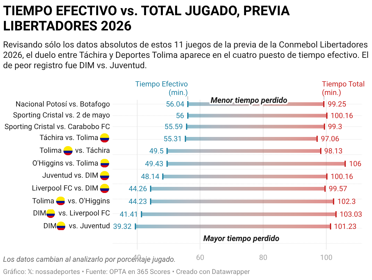 En ese escenario, Tolima dejó la mejor señal. Su partido ante Deportivo Táchira marcó el registro más alto, 57,17 % de tiempo efectivo y 55:31 minutos de juego real sobre 97:06. Hubo además 18 remates, con ocho al arco, una precisión de 44,44 %. Tolima remató cinco veces y anotó una vez: 20 % de efectividad. El juego se detuvo 90 veces y el tramo más largo sin interrupción fue de 3:48 minutos. Aunque no fue un partido perfecto, sí mostró continuidad y mejores secuencias.