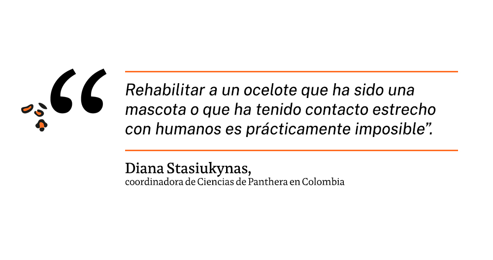 Al igual que ocurre con los jaguares, rehabilitar a un ocelote que ha sido una mascota o que ha tenido contacto estrecho con humanos es prácticamente imposible, según comenta Diana Stasiukynas, coordinadora de Ciencias de la organización Panthera en Colombia. Se han liberado algunos, pero nadie sabe muy bien qué ha ocurrido con ellos, ya que es muy costoso ponerles collares. En ese sentido, no se puede decir que esas liberaciones hayan sido exitosas.