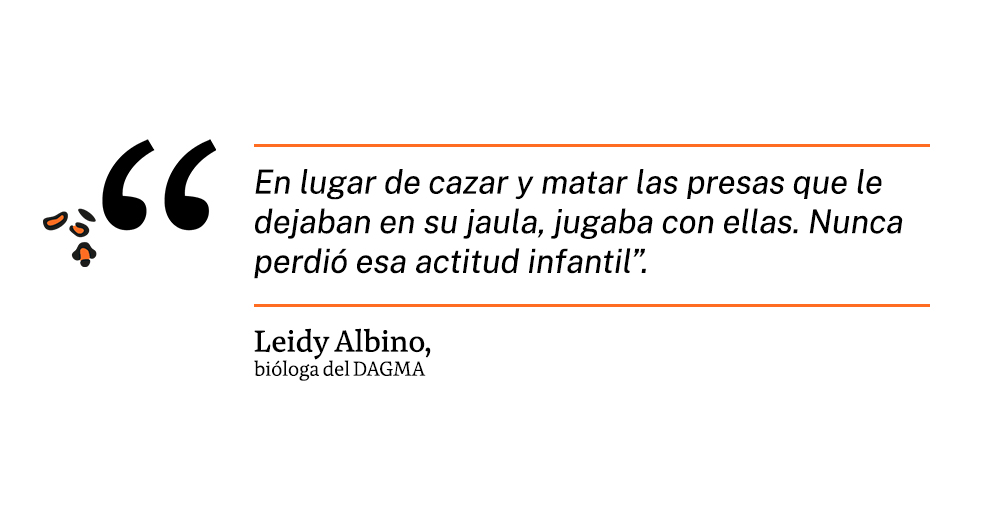 Ernesto no había alcanzado esa edad o, cuando menos, esa madurez. Tenía comportamientos juveniles y, por cómo buscaba a las personas era evidente que había sido la mascota de alguien. Buscaba acercarse a los humanos y jugar con ellos. En lugar de cazar y matar las presas que le dejaban en su jaula, jugaba con ellas. Nunca perdió esa actitud infantil, de acuerdo con Leidy Albino, una bióloga de 31 años que forma parte del equipo del DAGMA.