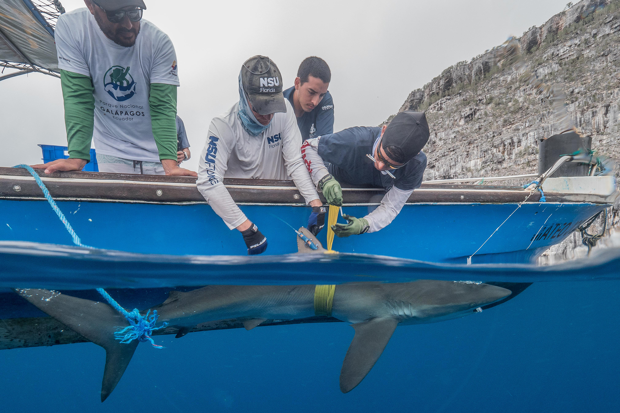 Los científicos viajaron en embarcación hasta las islas Darwin y Wolf, donde hay una de las mayores concentraciones de tiburones en el mundo. Antes de su llegada, prepararon anzuelos sin muerte, es decir, sin la pequeña púa tras la punta, minimizando el daño al animal. “Se lima el mecanismo para retener al tiburón, con lo cual la soltada es más fácil después de instalar el transmisor satelital”, explica Salinas de León.